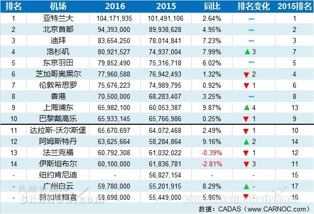 憑借其主要的中轉(zhuǎn)樞紐地位以及北美地區(qū)入境口岸的“戰(zhàn)略位置”,2016年亞特蘭大國際機場旅客吞吐量達到1.04億人次,同比增長2.64%。北京首都國際機場旅客吞吐量突破9000萬人次,達到了9439.3萬人次,同比增長約5%。迪拜國際機場繼續(xù)保持較高速的增長,發(fā)送旅客8365萬人次,保持第三。