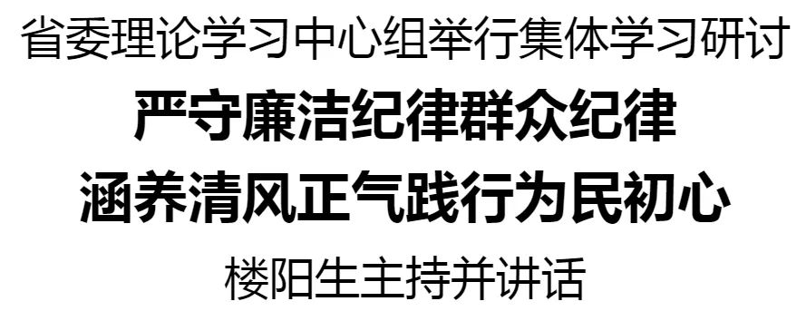 6月7日,省委理論學(xué)習(xí)中心組舉行集體學(xué)習(xí)研討,繼續(xù)深入學(xué)習(xí)《中國(guó)共產(chǎn)黨紀(jì)律處分條例》,重點(diǎn)圍繞廉潔紀(jì)律、群眾紀(jì)律進(jìn)行研讀。省委書(shū)記樓陽(yáng)生主持并講話。