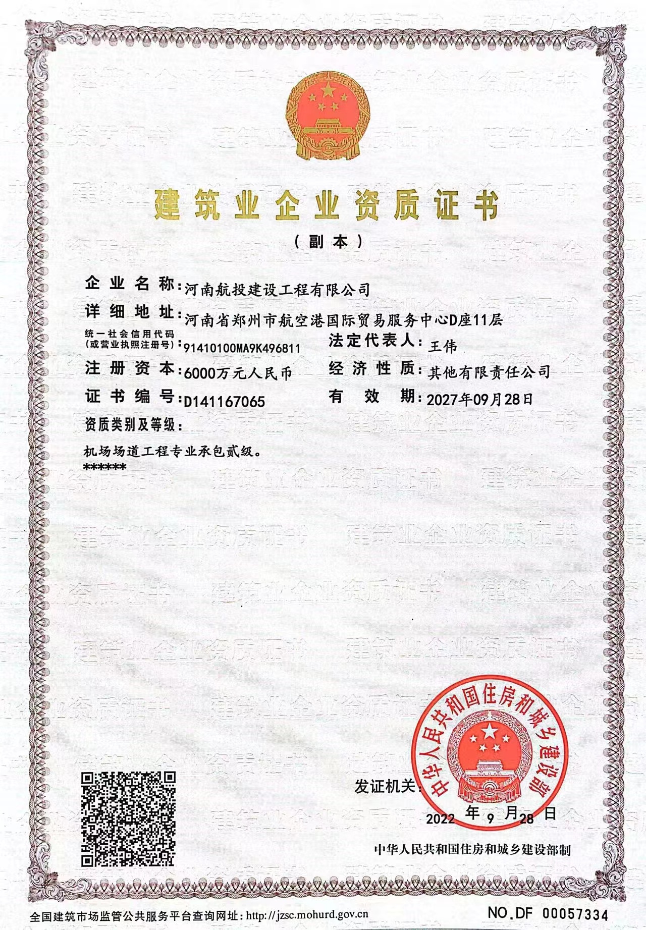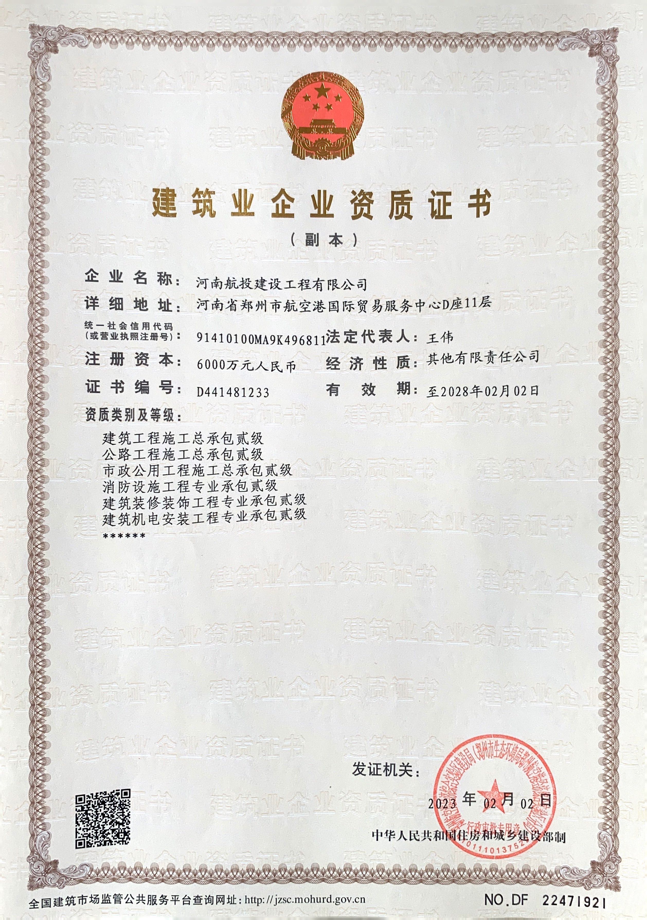 航投建工由河南航投集團(tuán)旗下河南航投航空基礎(chǔ)產(chǎn)業(yè)發(fā)展有限公司與貴州省場道工程有限公司共同出資成立。2022年9月28日,航投建工成功取得機場場道工程專業(yè)承包二級資質(zhì);同年12月8日通過河南省住建廳各項審核,取得《建筑施工企業(yè)安全生產(chǎn)許可證》,完成參與市場競爭的全部前置條件;12月23日,被評為鄭州航空港經(jīng)濟(jì)綜合實驗區(qū)建筑業(yè)重點培育企業(yè),為施工總承包及多項專業(yè)資質(zhì)的取得打下堅實基礎(chǔ)。