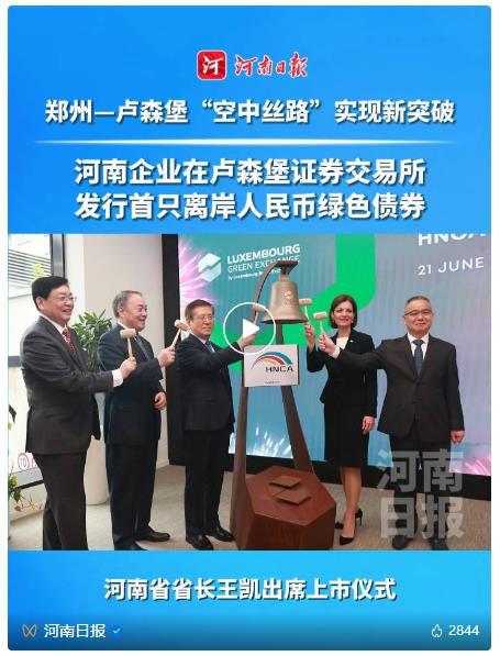 當(dāng)?shù)貢r間6月21日上午,中豫航空集團(tuán)以河南航投為主體發(fā)行的3年期人民幣境外債券上市儀式在盧森堡證券交易所舉行。這是中國企業(yè)在歐洲發(fā)行的首只支持可持續(xù)航空燃料(SAF)的綠色債券,也是河南企業(yè)發(fā)行的首只離岸人民幣綠色債券,鄭盧“空中絲路”資金融通實現(xiàn)新突破。
