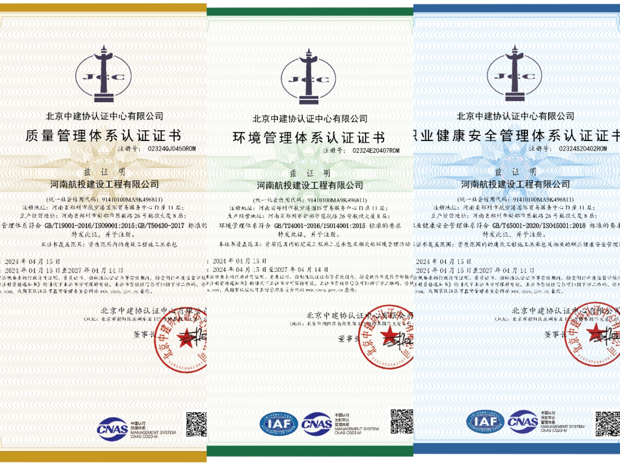 4月15日,河南航投建設(shè)工程有限公司(以下簡(jiǎn)稱航投建工)通過(guò)ISO9001質(zhì)量管理體系、ISO14001環(huán)境管理體系、ISO45001職業(yè)健康安全管理體系(以下簡(jiǎn)稱ISO三體系)認(rèn)證并獲得證書(shū),這標(biāo)志著航投建工的規(guī)范化標(biāo)準(zhǔn)化管理邁上新臺(tái)階,為持續(xù)提升市場(chǎng)競(jìng)爭(zhēng)力、拓展合作新領(lǐng)域打下堅(jiān)實(shí)基礎(chǔ)。