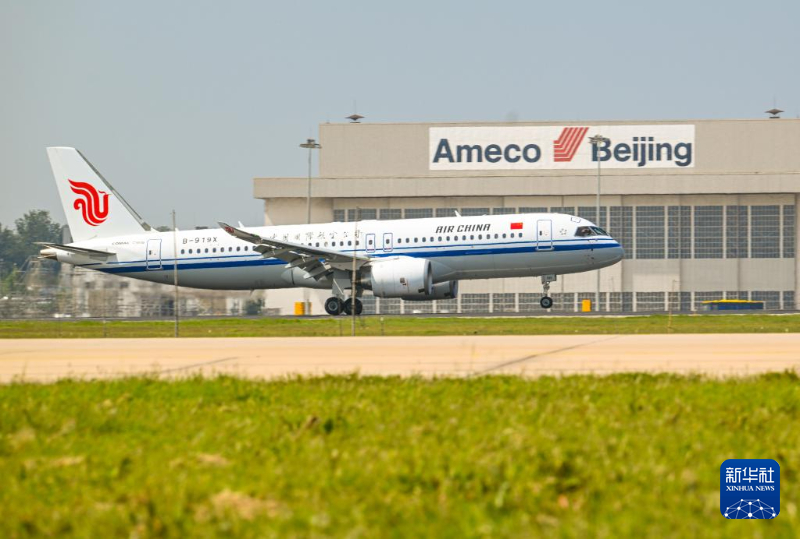 8月29日,國航首架C919國產(chǎn)大飛機降落北京首都國際機場。新華社記者 李賀 攝