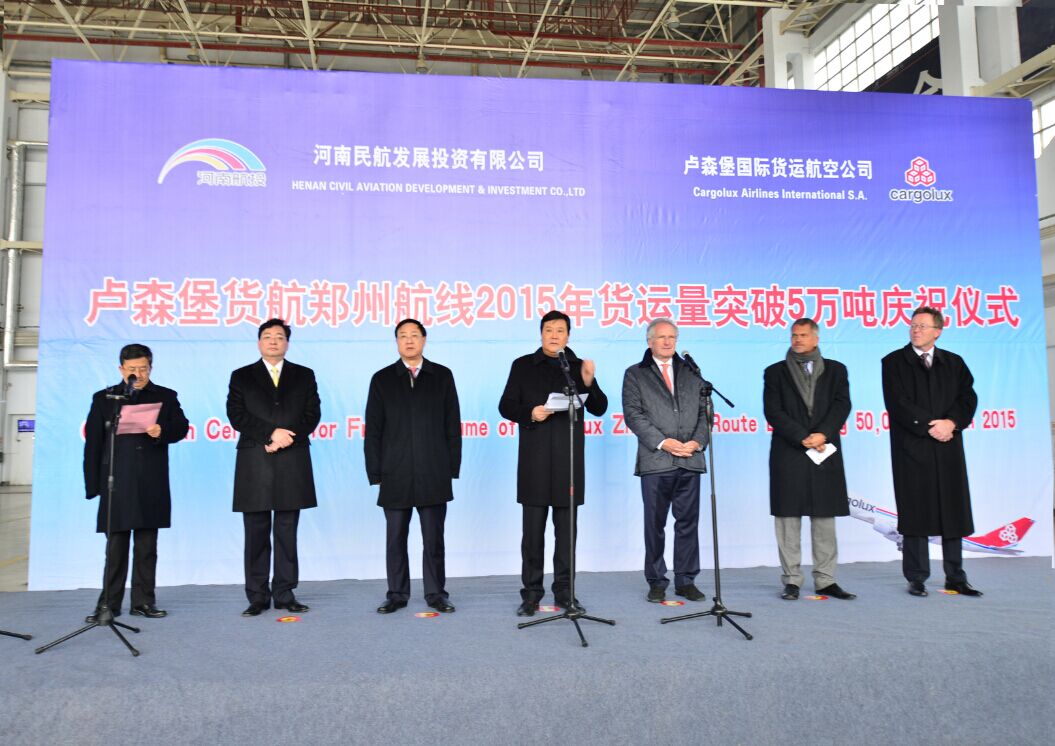 當天中午,河南民航發(fā)展投資有限公司與盧貨航聯(lián)合在鄭州機場舉行了簡短熱烈的慶祝儀式。河南省副省長趙建才出席儀式并致辭,盧森堡駐華大使石泰嵋宣讀盧森堡可持續(xù)發(fā)展與基礎產業(yè)部部長弗朗索瓦?鮑施的賀信,省政府副秘書長張雷明主持儀式。省直單位有關負責人親臨現(xiàn)場。河南航投董事長、黨委書記張明超,總經(jīng)理、副董事長、黨委副書記劉建葆,公司領導悅國勇、鄭立亮、郭艷紅以及盧貨航董事會主席保羅?海明格、盧貨航總裁兼CEO德克?李奇同時參加儀式。