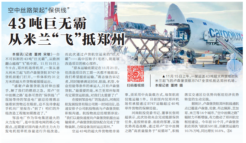 本報(bào)訊(記者 董娉 宋敏)一臺(tái)不可拆卸的43噸“巨無(wú)霸”,從歐洲翻山越海“飛”抵中原。11月15日上午9點(diǎn),鄭州機(jī)場(chǎng)停機(jī)坪,一架從意大利米蘭起飛的盧森堡貨航B747全貨機(jī)前艙門打開(kāi),一件體積約31立方米的超大件貨物被緩緩運(yùn)出。